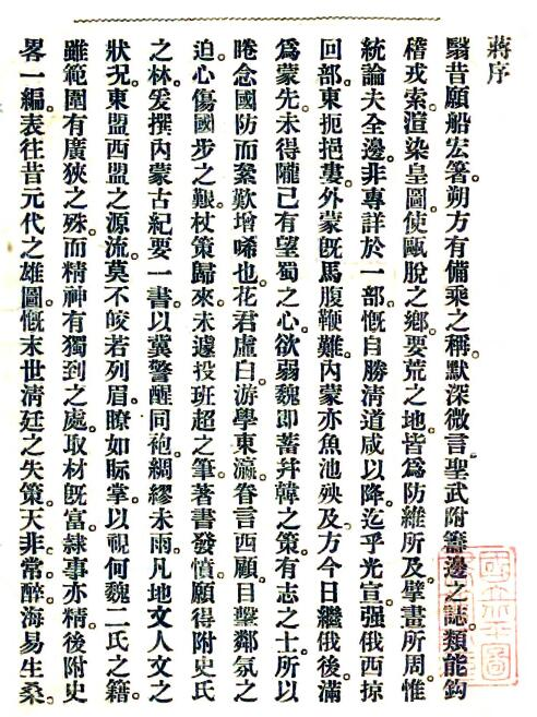 花楞编。民国五年(1916)铅印本。全志分为五编,第一编总论为蒙古及内蒙古之意义,位置面积,疆界;第二编地文地理为山脉,河流,湖沼,沙漠,气候;第三编人文地理为居民(人种、人口、语言文字、风俗)、政教(行政区划、教育、宗教、兵备、财政)、物产(牧、农、矿、工、猎、渔)、交通(道路、水运、陆运、驿站、邮务、电报、铁路);第四编各部之状况;第五编史略。附图(现势图、农产品图、畜产品图)。