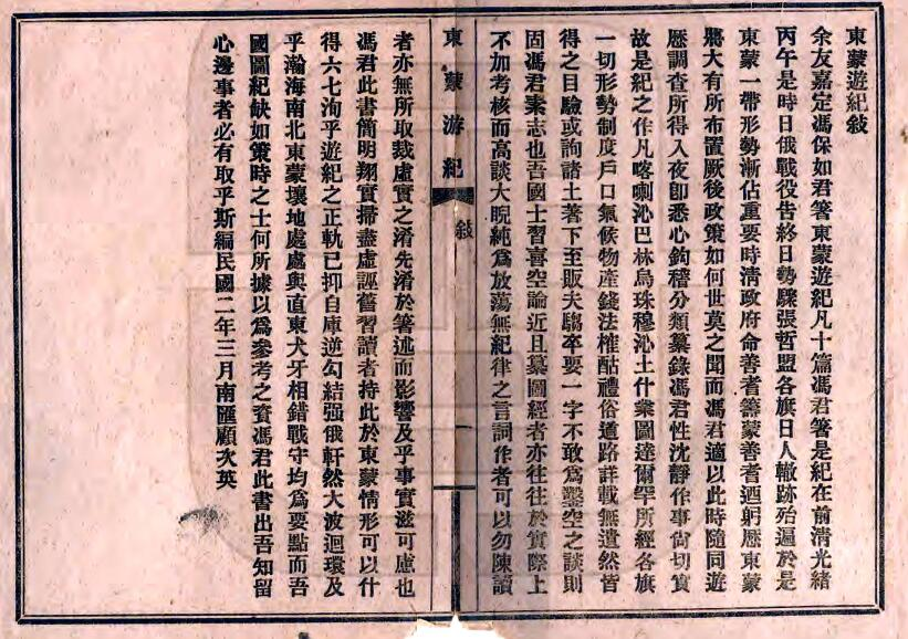 《东蒙游记》一书,又名《内蒙古东部调查日记》,作者冯诚求,字保如,嘉定人。是书撰于清光绪三十二年(1906年),“是时日俄战役告终,日势骤张,哲盟各旗,日人辙迹殆遍”。于是清政府命善者筹蒙,善者亲历东蒙,冯诚求、陈祖墡(撰《东蒙古纪程》)、吴禄贞(撰《东四盟蒙古实纪》和《经营蒙古条议》)、姚锡光(撰《筹蒙刍议》)等随同游历调查。冯诚求每至一地调查所获,按月日记录,悉心钩稽,分类築集。凡所至之地,有喀喇沁、巴林、乌珠穆沁、土什业图、达尔罕等。“所经各旗,一切形势、制度、户口、气候、物产、钱法、榷酤、礼俗、道路,详载无遗;然皆得之目验,或询诸土答,下至贩夫、驺卒,要一字不敢为凿空之谈”。全书编例,按月日系事,始于光绪三十二年三月十八日午一时,讫于是年五月十九日午后九时。全书厘为十卷,分别为:自北京至古北口,自古北口至热河,自热河至喀喇沁王府,自喀喇沁王府至赤峰,自赤峰至乌丹城,自乌丹城至巴林阪,自巴林阪至西乌珠穆沁,自西乌珠穆沁至土什业图,自土什业图至新民屯,自新民屯至北京。其书体裁,既为日记,又是纪程,是研究当时东蒙古政治、经济、山川、地理、风物、人情诸方面的重要参考文本。