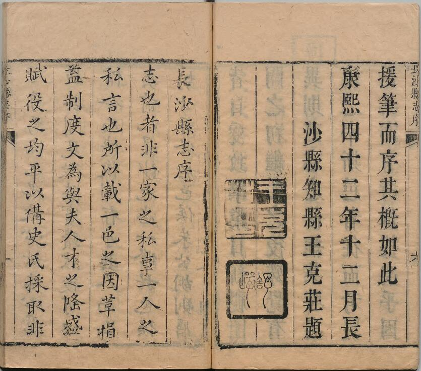 湖南省长沙市地方志,康熙长沙县志十卷,清王克庄修,朱奇政等纂。克庄,字舒岩,顺天宛平(今北京)人,廪生,康熙三十七年(1699)长沙知县,擢湖北布政使。奇政,一名奇珍,字平斋,湖南长沙人,举人,历任同安、湖口知县,著有《易解》、《同安县志》、《平斋全集》等。康熙长沙县志始修於康熙四十二年,上续康熙二十四年朱志,阅数月成书,记事亦上於是年底。正文分十四门八十六目,约十六万字,为长沙四修县志。康熙长沙县志序言谓:”星野、山川、职官、人物等项悉依旧志,只订其讹,而学校、田赋、户口、屯田则翔加厘订,已焕然改观”。康熙长沙县志学校志颇为翔实,如镌刻约束生员条教之卧碑及新近颁发之”圣谕”等能及时加以编次;廪饩、学田、书院亦悉加备载,至修茸学宫、扩大殿庑、创建尊经阁等史实,更反映了当时教育之盛况。康熙长沙县志赋役志记明清田赋、户口、丁粮、佣调与康熙时履亩清丈等情,亦颇有特色。艺文所载凡纪胜所题,详议、条约、禁饬、政训所关”肃官箴”、”悯民瘼”之类,旧志所未详载者,今悉搜采增入,篇幅宏富,约占全书三分之一。长邑自汉迄清二千多年历代名城,名宦门仅志宋陈希等十二人,流寓亦只屈原、司马迁等十二傅,其他人物不逾百人,记事悉仍旧志,虽可见编纂之严谨,但仍嫌传记过少。有康熙四十二年(1703)刻四十九年(1710)增补刻本。
