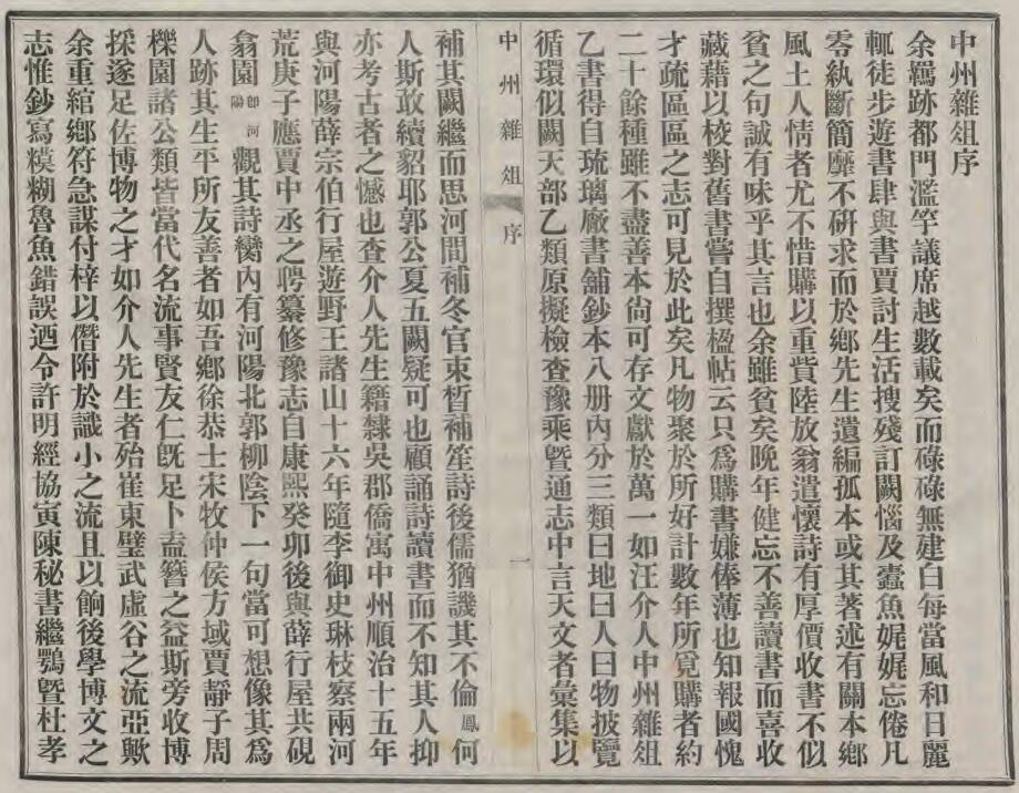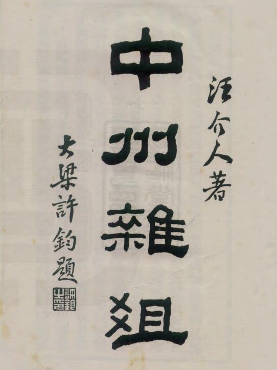 河南省地方志,中州杂俎,清汪价撰、民国张凤台厘订,1931年铅印本。汪价字介人,号三侬外史,吴郡人,侨居河南。顺治中曾参予纂修《河南通志》。中州杂俎为撰者游河南时笔录所见所闻,以考订史籍之失。中州杂俎向无刻本,民国初年,张凤台得稿本于北京琉璃厂书肆, 加以厘订出版。中州杂俎全书二十一卷, 分地理、人纪、物类三大类,卷二十一为附录。中州杂俎其地理子目为:封国、郡邑、山陵、川泽、宫室;中州杂俎人纪子目为:帝迹、圣迹、贤迹、宦迹、文迹、武迹、忠迹、孝迹、义迹、节迹、隐流、羽流、缁流、术流、女史、老史、儿史、凶史、异史、人杂;中州杂俎物类子目为:鸟志、兽志、鳞志、虫志、草谱、木谱、花谱、果品、谷品、菜品、饮案、食案、器考、物考;中州杂俎附录为诗脔,以诗话形式记述本人诗作。中州杂俎资料丰富,为河南重要地方文献。