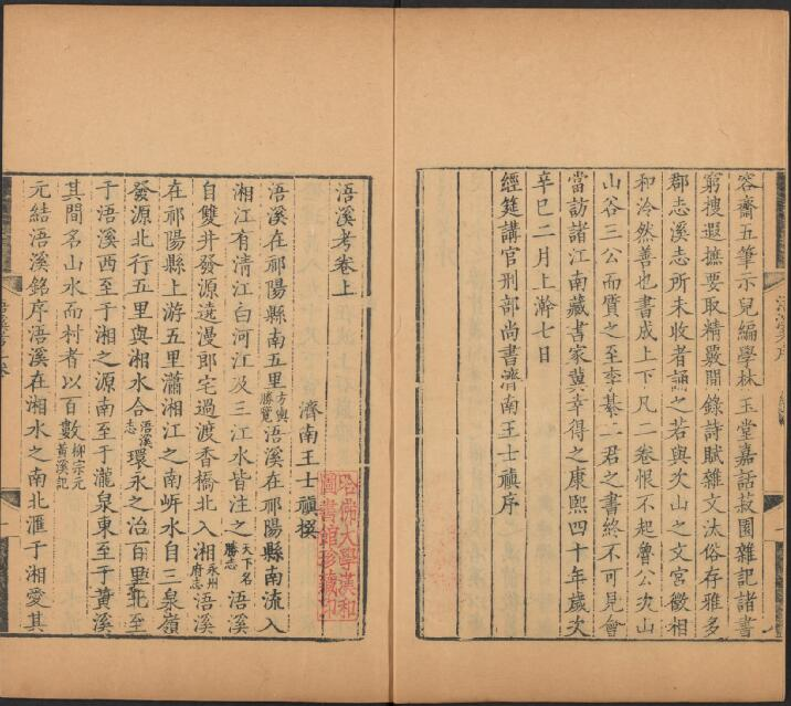 湖南省永州市祁阳县地方志《浯溪考》·二卷(山东巡抚采进本),清王士祯撰PDF高清电子版影印本下载。王士祯(1634年—1711年),原名王士禛,字子真,一字贻上,号阮亭,又号渔洋山人,世称王渔洋,谥文简。山东新城(今桓台县)人,常自称济南人。清顺治十五年(1658)进士,康熙四十三年(1704年)官至刑部尚书,颇有政声。清初杰出诗人、文学家,继钱谦益之后主盟诗坛,与朱彝尊并称“南朱北王”。诗论创“神韵”说,于后世影响深远。早年诗作清丽澄淡,中年转为苍劲。擅长各体,尤工七绝。好为笔记,有《池北偶谈》、《古夫于亭杂录》、《香祖笔记》等。是书前有自序,称“楚山水之胜首潇湘,潇湘之胜首浯溪。浯溪以唐元结次山名,得鲁公摩厓书而益张之。旧有浯溪前后两《集》,为李仁刚、綦光祖撰,见於舆地碑目,皆无传。今志乃出庸手,冗杂泛滥,至不可耐。乃以退食之暇,穷搜遐摭,要取精核。”间录诗赋杂文,多郡志、溪志所未收者。盖其族侄官祁阳时,以旧志寄士祯,士祯为改作也。其书不分门目。上卷载山川古迹及元结诗文,而附以诸家之题识议论。下卷则皆后人艺文,末为补遗三条。书颇简核。然如王邕《后浯溪铭》、吴儆《祁阳石镜铭》、邹浩《甘泉铭》,其地相近,类附可也。吴师道《汪氏浯村记跋》,地在新安,氵眇如风马,亦复载入,殊乖体裁。盖断限之难,刘知几尝言之矣。